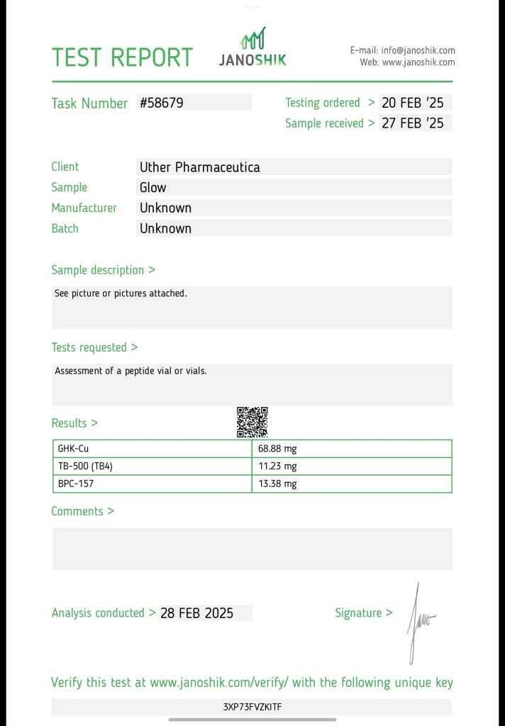 The Glow Protocol is an advanced research peptide blend formulated for skin rejuvenation, anti-aging, and tissue regeneration. This unique combination of GHK-Cu (Copper Peptide), BPC-157, and TB-500 is designed to support studies on enhanced wound healing, collagen synthesis, and reduction in oxidative stress — offering a research-backed pathway to youthful, vibrant skin.