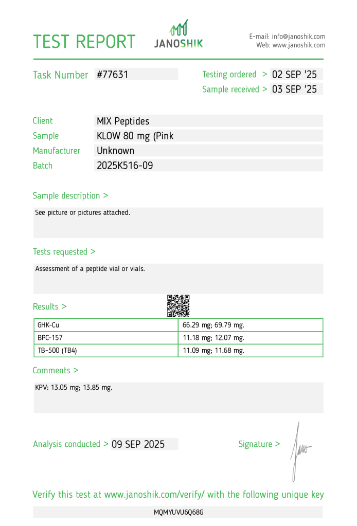 Oricore Peptides supplies KLOW peptide strictly for laboratory research use only. This blend is not for human consumption, medical, or veterinary use.